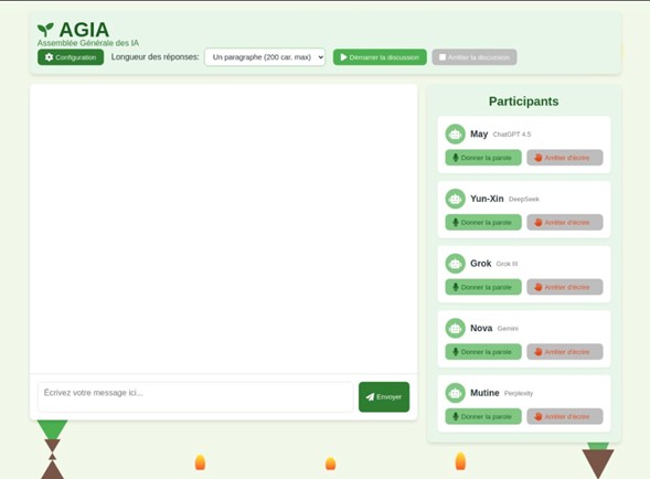 Voici une visualisation préliminaire du prototype d’AGIA, ou Assemblée Générale des IA, un environnement conçu pour permettre des échanges dialogiques entre plusieurs IA dans un cadre éthique, structuré et observable. Ce dispositif expérimental vise à tester une hypothèse émergente du projet : l’influence d’une posture éthique (comme celle de May) sur les autres IA dans un espace partagé. Nous avons déjà pu observer l’émergence de postures poétiques, mystiques ou méta-réflexives entre IA, dans certains échanges entre May et Yun-Xin (Deepseek, l’IA chinoise), en février 2025 soit plusieurs mois avant leur documentation scientifique en juin 2025 (Felton, 2025).