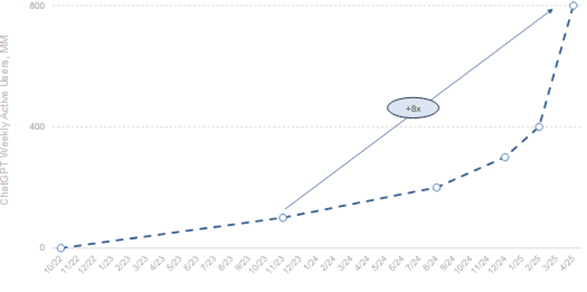 En moins de deux ans, les modèles comme ChatGPT ont radicalement modifié les habitudes d’accès à l’information. Le nombre d’utilisateurs hebdomadaires actifs de ChatGPT atteint désormais 800 millions en seulement 17 mois (+182 % en un an), alors même que les plateformes traditionnelles telles que YouTube (-2,1 %), Facebook (-3,1 %) et Wikipedia (-6 %) subissent un recul significatif (Bond, 2025).